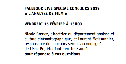 FACEBOOK LIVE SPÉCIAL CONCOURS 2019 L’ANALYSE DE FILM Samedi 16 février aura lieu la première épreuve du 1er tour : l’analyse de film. Nicole Brenez, directrice du département analyse et culture cinématographique, et Laurent Moissonnier, responsable du concours seront accompagnés de Lisha Pu, étudiante en 1re année pour répondre à vos questions (…)
