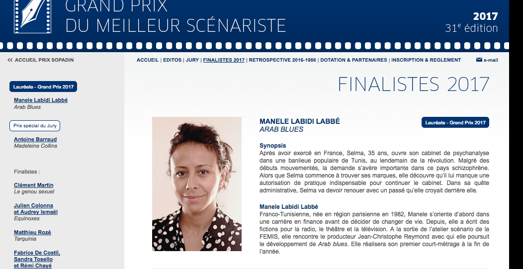 Sopadin 2017 : Bravo à Manèle LABIDI LABBÉ (Atelier Scénario 2016) ! Bravo à Manele Labidi Labbé (Atelier scénario 2016), lauréate du Grand Prix Sopadin 2017 pour son projet « Arab Blues ». Franco-Tunisienne, née en région parisienne en 1982, Manele s’oriente d’abord dans une carrière en finance avant de décider de changer de vie. Depuis, elle a écrit des (…)