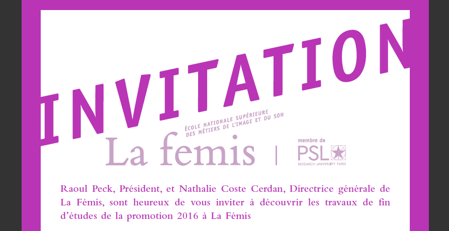 Présentations des travaux de fin d’études 2016 Huit soirées, du 30 septembre au 13 octobre sont consacrées à la présentations des travaux des diplômés de la promotion 2016 à La Fémis. Réservation obligatoire par mail en précisant bien la (ou les) date(s) de projection à invitations@femis.fr Entrée libre dans la limite des places (…)