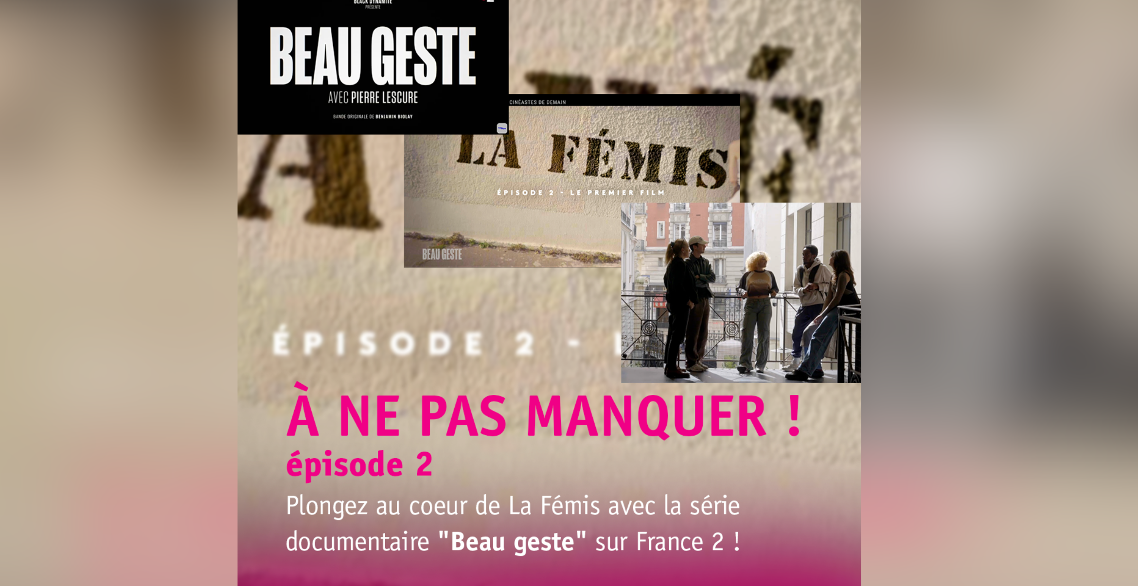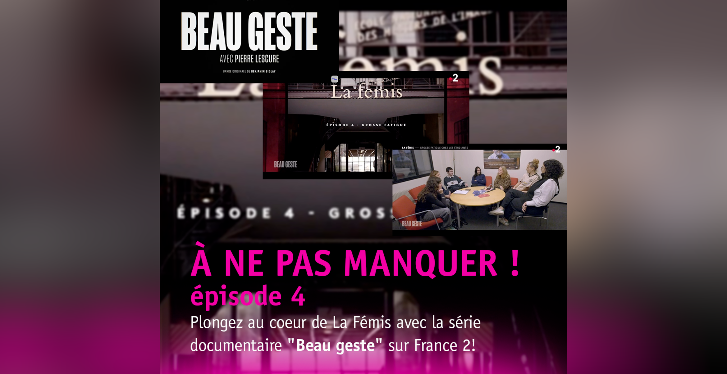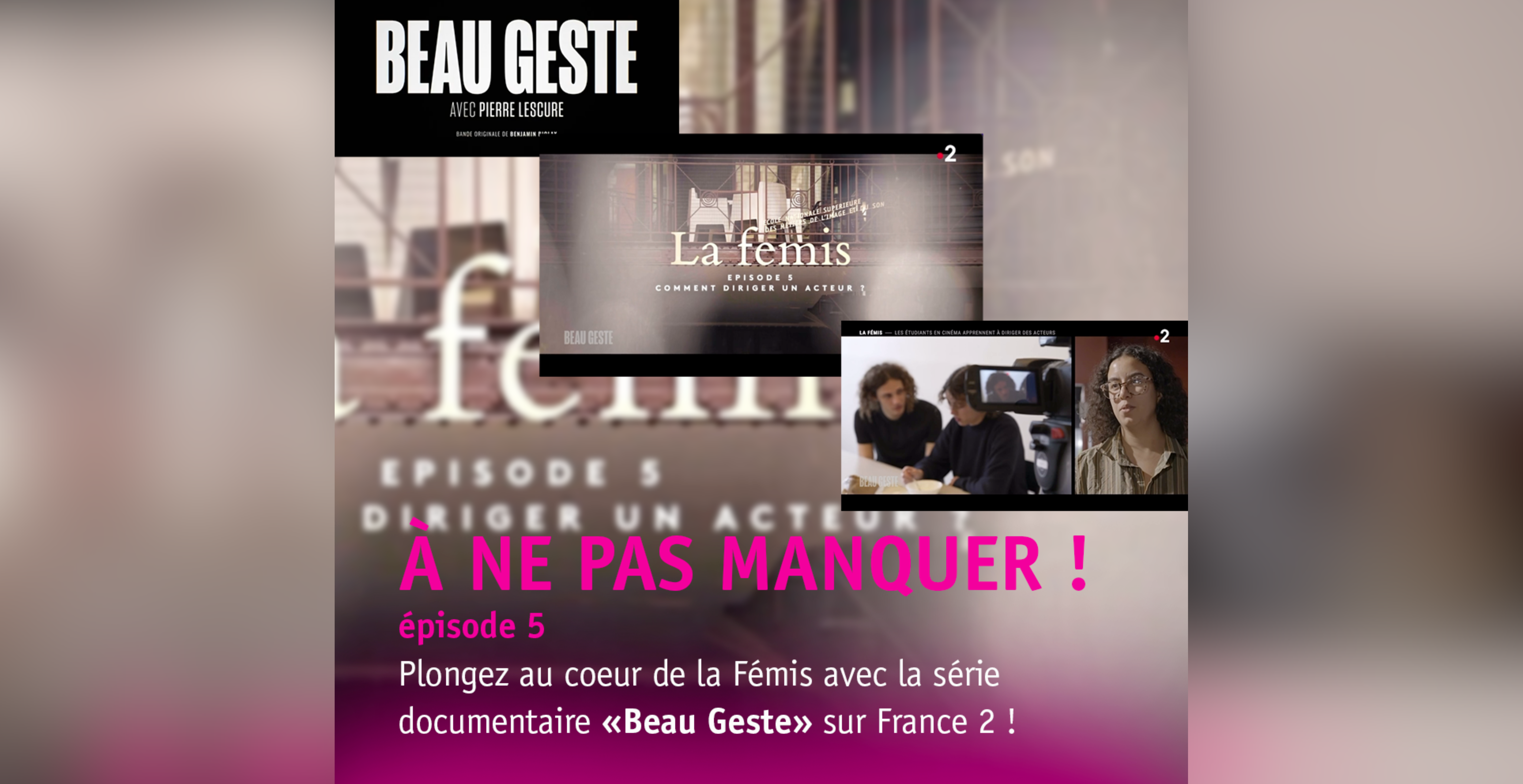ÉPISODE 5 /PLONGEZ AU CŒUR DE LA FÉMIS AVEC LA SÉRIE DOCUMENTAIRE « BEAU GESTE » SUR FRANCE 2 ! Pierre Lescure et son équipe suivent des étudiants et étudiantes de 1re année tout au long de leur première année à l’école. Tour au long de ce feuilleton vous suivrez ces futurs réalisateurs, chef opérateurs, producteurs, monteurs ou encore scénaristes explorant l’univers de La Fémis et se (…)