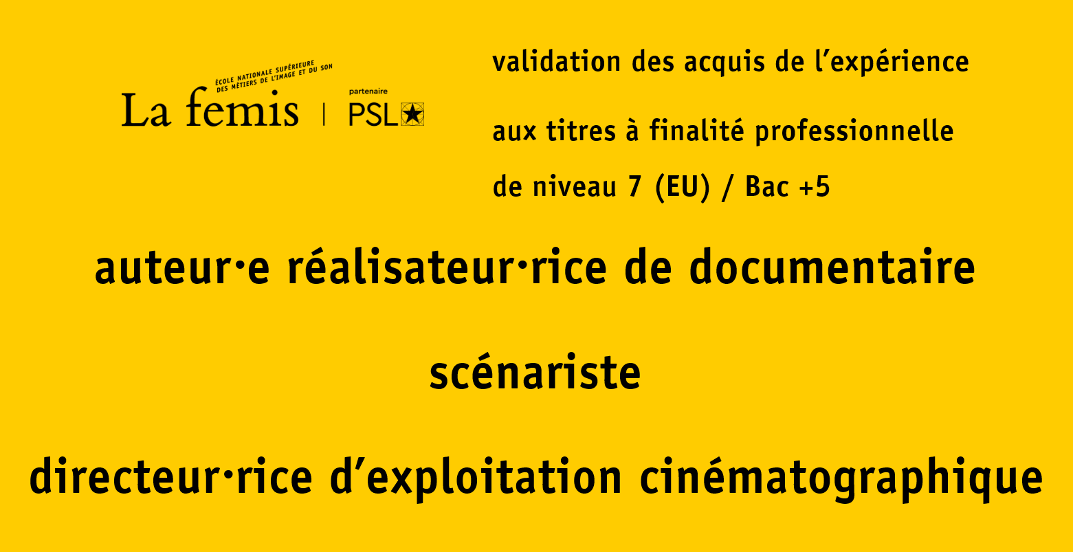 VAE au titre d’Auteur-réalisateur de documentaire Il est possible d’acquérir un titre professionnel d’Auteur-réalisateur de documentaire délivré par la formation continue de La Fémis sur la base de ses acquis et de son expérience professionnelle.