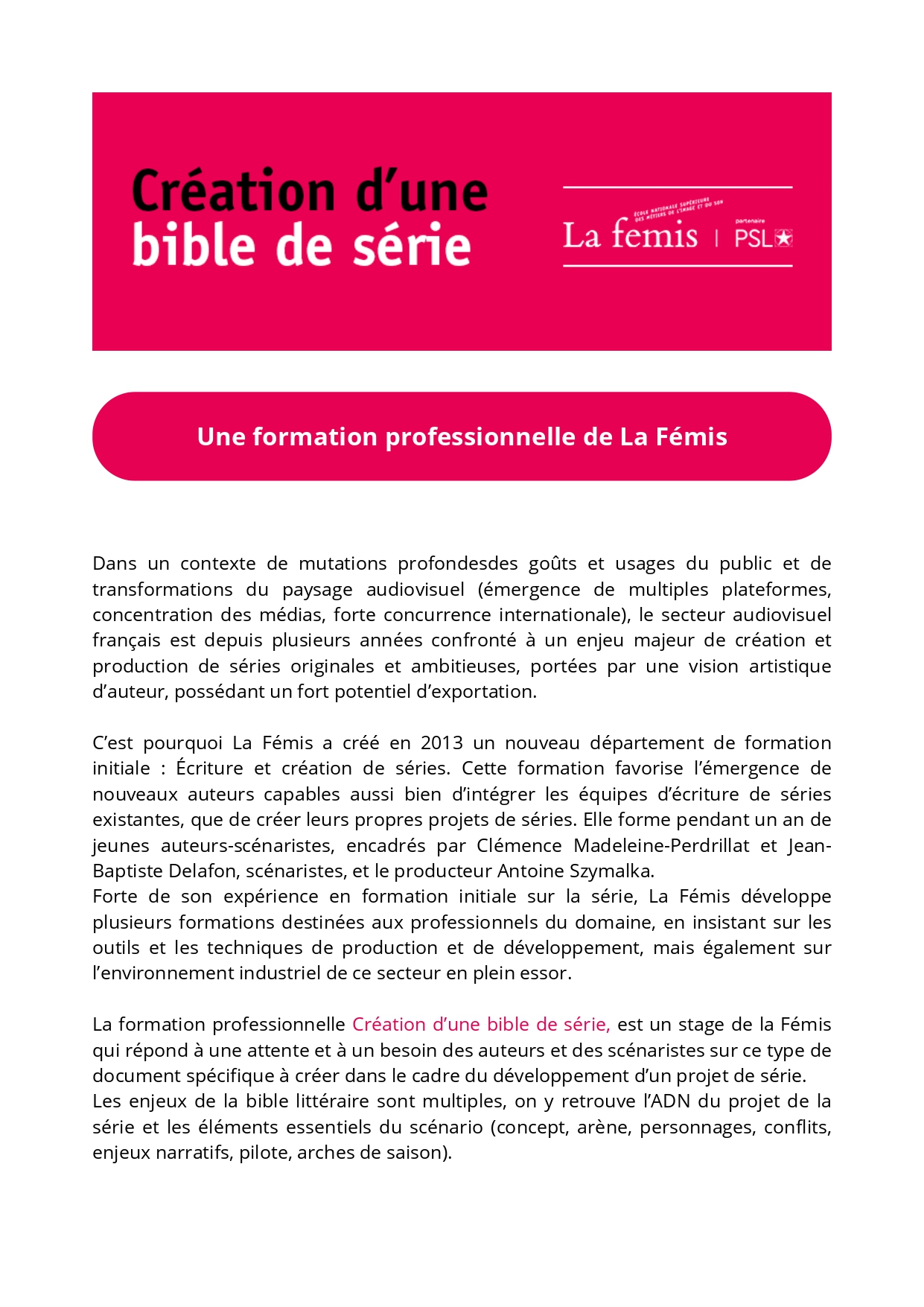 La Fémis a inauguré en 2022 une nouvelle formation professionnelle : Création d’une bible de série accessible à des scénaristes de fiction confirmés qui ne maîtrisent pas encore les codes d’écriture de la bible littéraire d’une série de fiction.